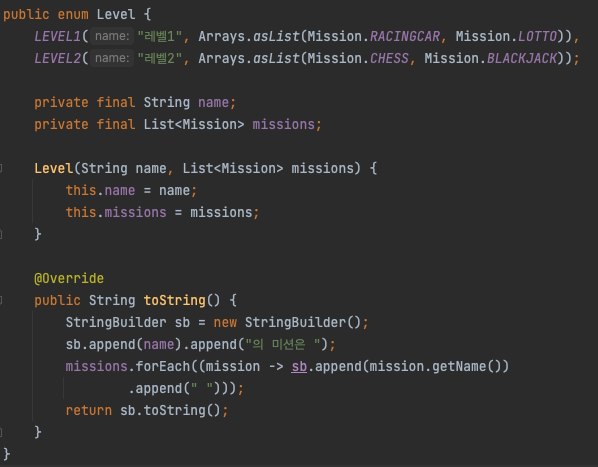 실제와는 같지 않지만 우아한 테크코스의 미션들을 레벨 별로 관리해야 하는 상황이 생겼다고 가정하여 코드를 작성했습니다.