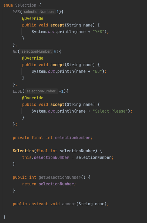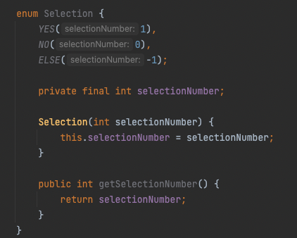 위의 선택지에서 selectionNumber를 처리하는 과정을 enum 클래스로 분리해보았습니다.