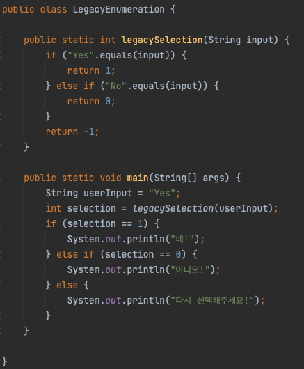 왜 enum 을 사용해야 하는지 알아보기에 앞서 과거 enum을 모르던 시절 사용자 입력값에 대한 선택지를 변환하여 특정 로직을 실행시키던 코드를 살펴봅시다.