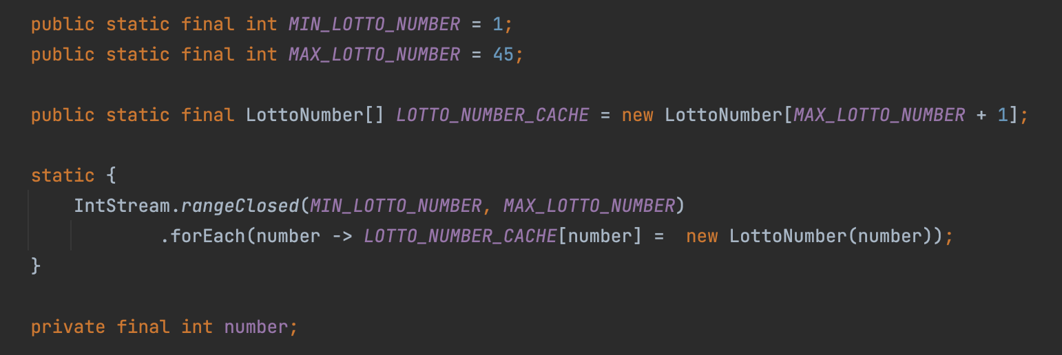 이렇게 코드가 개선되면 최초 1 ~ 45 까지의 LottoNumber 인스턴스 생성 비용 외에 사용하는 비용이 없습니다.