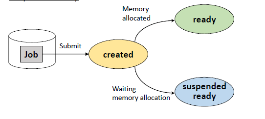 프로세스가 생성되는 시점이다. 디스크의 Job을 커널에 등록하여 PCB를 할당받고 프로세스를 생성한다. 만약 메모리가 할당된다면 Ready 상태로 이어지고, 메모리가 할당되지 않는다면 지연 Ready 상태로 전환된다.