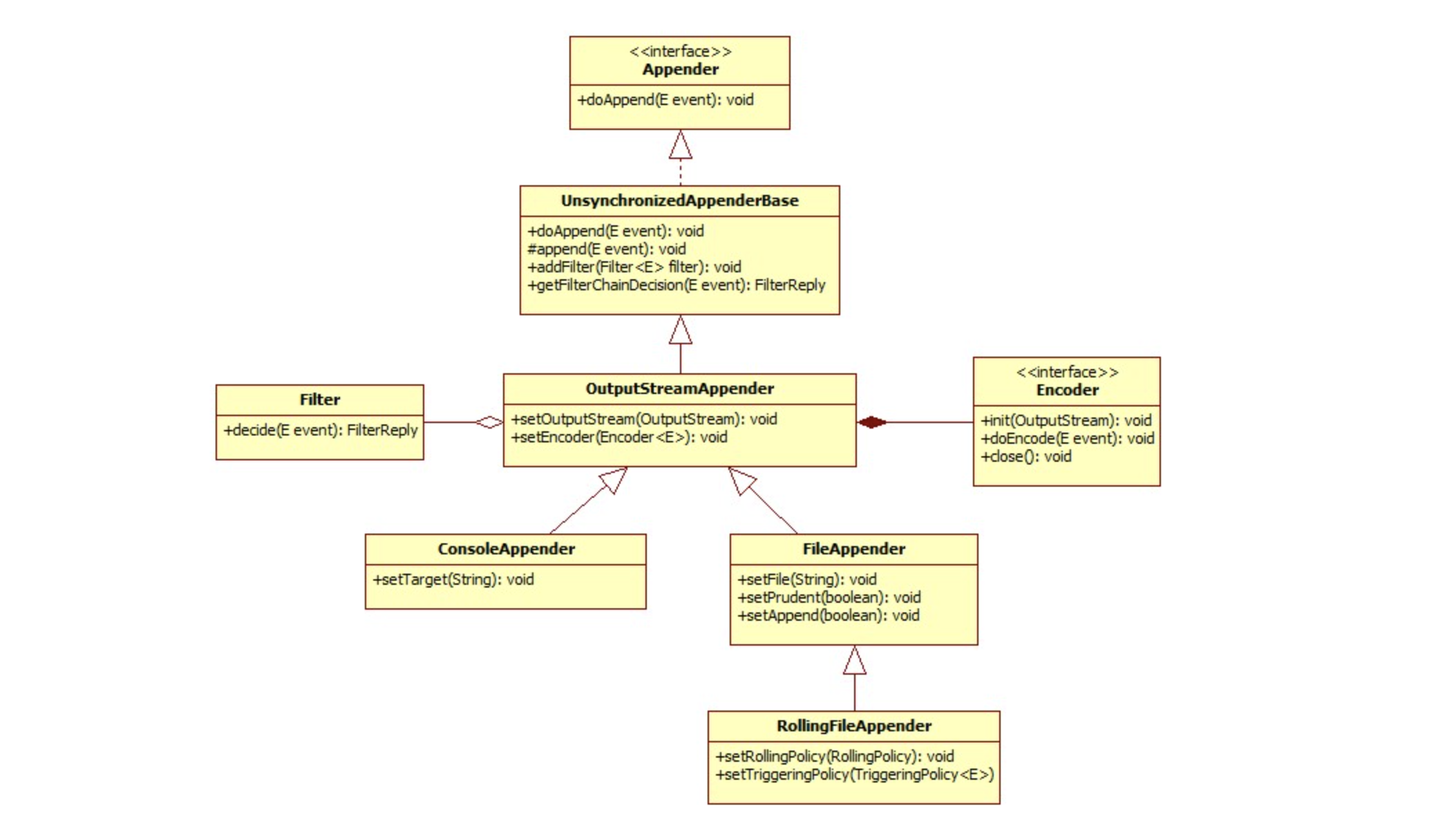 위 사진이 바로 Logback-core의 핵심이 되는 존재인 Appender입니다. Appender는 방금 xml 코드에서 봤던, 설정의 root가 되는 존재인데요.