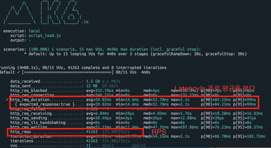 - 부하테스트를 통해 최적의 성능을 찾아가는 과정에서는 Throughput과 Latency에 집중하면 좋을 것 같습니다. RPS와 요청 - 응답 속도가 예상한 부하 상황에서 최적의 성능을 내는지 점검해보아야 합니다. Metric