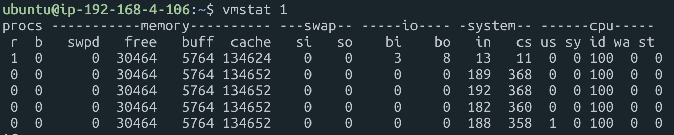 vmstat명령어를 통해 현재 리눅스 서버에 CPU, Memory, Swap, Io, System call 등의 지표를 확인할 수 있습니다. 지표보는법