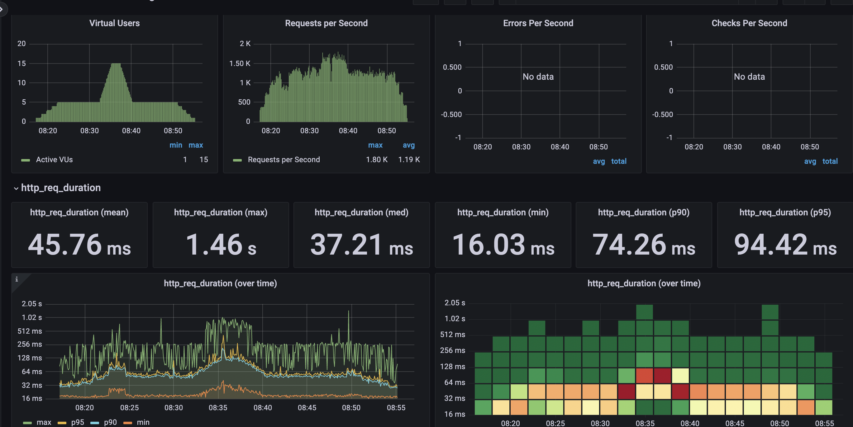 - Grafana로 지표를 수집하여 시각화 한 결과를 볼 수 있습니다. 어느 지점에서 어느정도의 요청을 수행하는지 확인할 수 있습니다.
